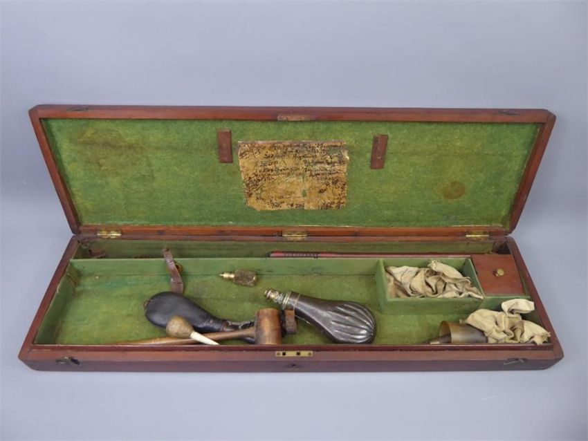 An English Mahogany Gun Case, for single barrel shotgun, circa 1780, brass name plaque inscribed Edward Montresor Esq 55th Regiment. (with a split to the lid). Provenance: The owner of this collection excavated Hailes Abbey in Winchcombe over many seasons, and during his years with English Heritage, was largely responsible for developing the collection of historic artillery now on display at Pendennis Castle in Cornwall.