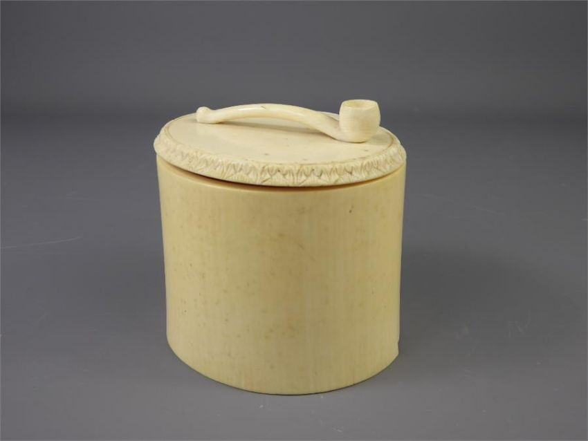 A 19th Century Ivory Cylindrical Tobacco Jar and Cover, the cover surmounted with carved tobacco pipe, approx 10 cms x 10 cms diameter.