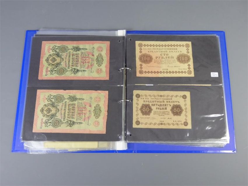 A Folder of 91 Banknotes, including 1956 GB £5, early 20thC European/Russian issues and Chinese Republic. Some uncirculated.