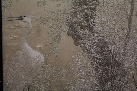 A Circa 1920's Japanese Silk Embroidered Room Divider. The four panelled screen exquisitely worked with waterbirds and landscape, held together with lace ties. (af)