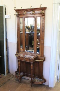 A French Coat Rack and Umbrella Stand. The stand has a marble surface over a drawer, with central mirror flanked by two further mirrors, brass umbrella railings with drip trays, four brass coat hooks, reeded finish to rear and turned supports, approx 100 x 30 x 197 cms.