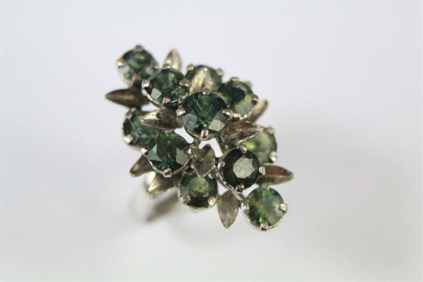 A Ladies Vintage White Gold and Green Stone Floral Ring. The ring set with 11 round stones, in a leaf-form setting, size P. (possibly green sapphire), stamped 18k.