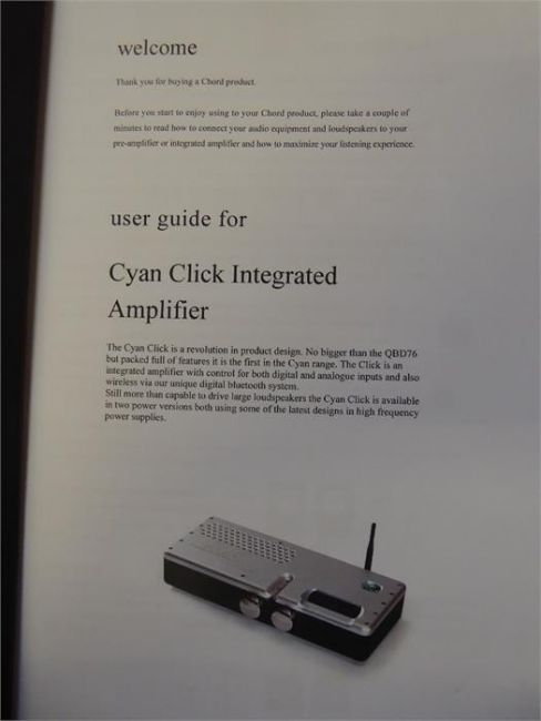 A 'Chord Cyan Click' Amplifier with remote and manual. Serial number 15127. No guarantees given.This item has been tested for Electrical Safety only. It has not been functionally tested.