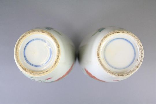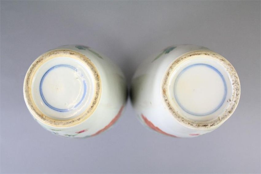 A Pair of 19th Century Chinese Famille Rose Baluster Vases. The vases painted in colour depicting flowering chrysanthemums and other plants emanating from a rock, approx 30 cms, double circles to base.