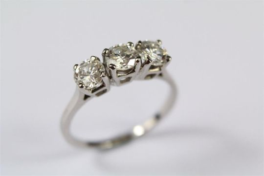 A White Gold Three Stone Diamond Ring. The ring set with approx 1.25 cts of dias, size L, approx 2.3 gms.