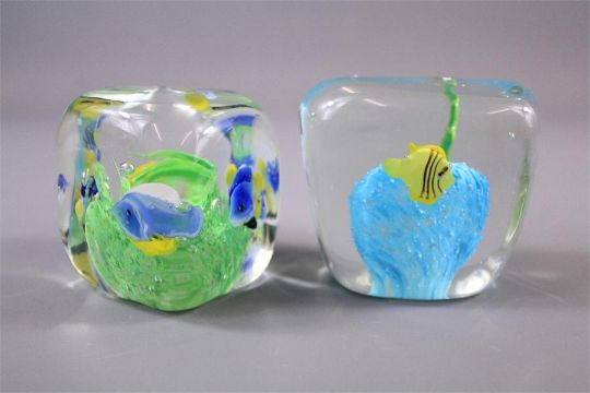 A Pair of Murano Glass Aquarium Paperweights. The weights (believed to be made by Riccardo Licata) depicting tropical fish in a fish tank, approx 6 x 6 cms.