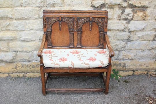 An Antique Oak Bench. The bench with decorative blind carving to the back and a panel seat, approx 92 x 112 x 72 cms.