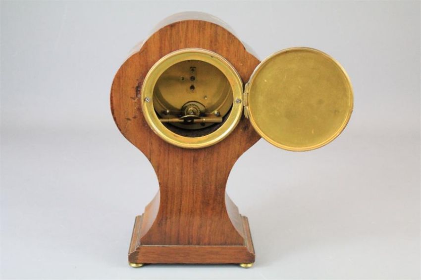 John Bull & Co Bedford Mantel Clock. The mahogany waisted clock case with decorative inlay. The clock with white enamel face with Roman dial and Arabic second numerals, approx 26 cms.