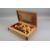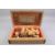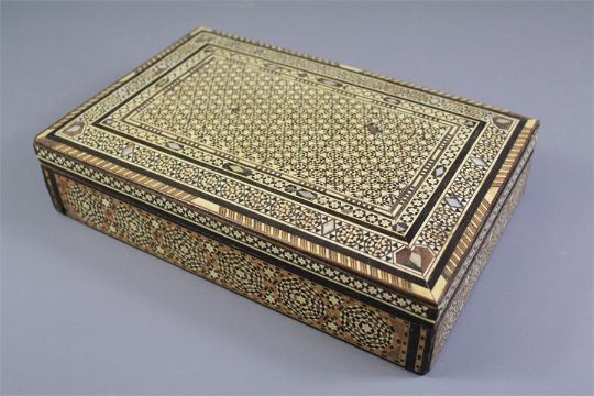 A Syrian Marquetry Box. The box inlaid with bone, mother of pearl and exotic timbers the box complete with a chess set, approx 30 x 19 x 8 cms. (some minor loss) together with a handmade chess board.