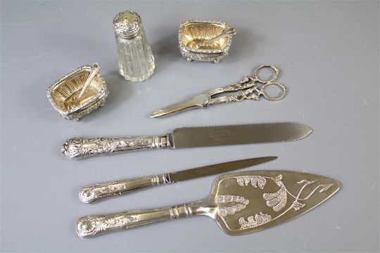 Miscellaneous Silver. This lot includes two silver salts and salt spoons, Chester hallmark dated 1898, mm John & William Deakin, a silver-topped cut-glass pepper pot, silver handled cake knife Sheffield hallmark, mm EV dated 1962, together with a silver plated cake slice, grape scissors and letter opener.