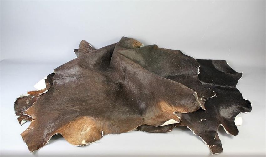 Four Cow Hides. This lot includes a large cream and brown 95 x 99 cms, a dark brown 87 x 77 cms, a large black hide 92 x 110 cms and a dark brown 90 x 100 cms.