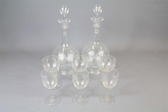 A Pair of Glass Decanters and Glasses. The glasses beautifully etched with 'bird of paradise' and other birds, five port and fifteen sherry glasses all etched with birds of all variety.