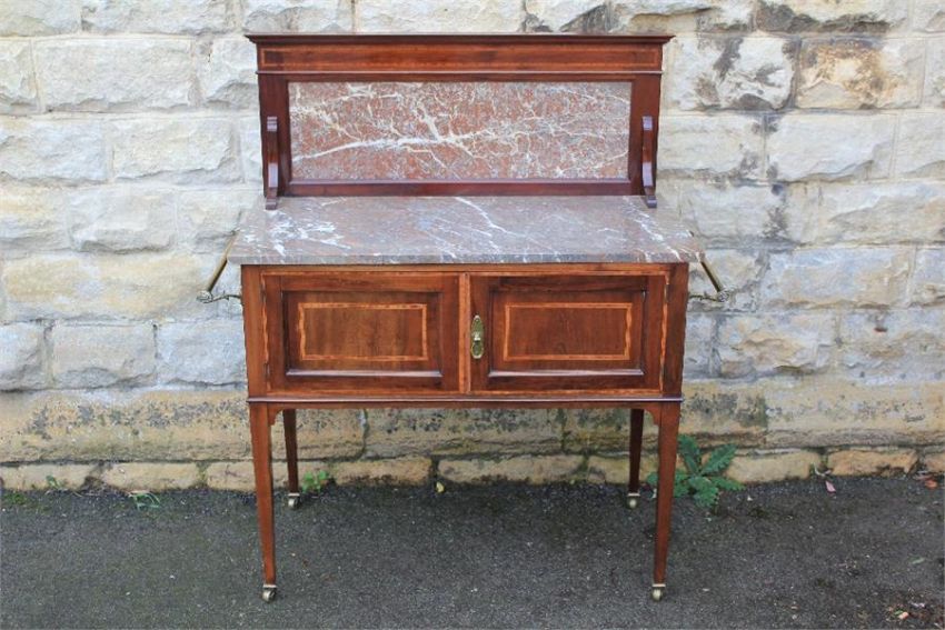 An Edwardian Marble Top Wash Stand. The wash stand rose marble surface with double cupboards beneath and flanked by brass towel rails, raised on tapered feet, approx 93 x 52 x 115 cms.