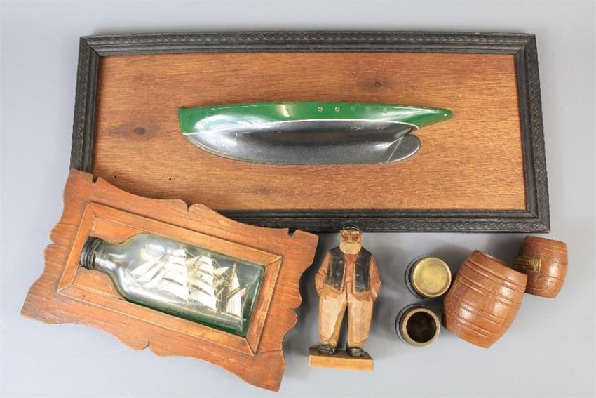 Miscellaneous Vintage Wooden Items. This lot includes a 'Ship in a Bottle' mounted in a wooden frame, a 3D ship mounted in a wooden frame, a hand-carved wooden seafaring man, two miniature wooden barrels (both with brass cartouches 'HMS Ganges' and 'HMS Iron Duke') together with two brass barrels. (7)