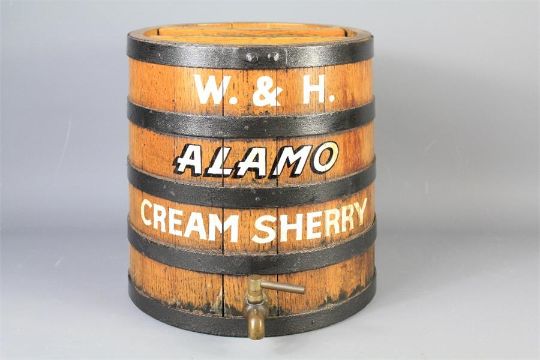 A Vintage Wooden Williams and Humbert Barrel. The metal banded barrel marked 'Alamo Cream Sherry', with metal tap, approx 28 x 26 cms dia.