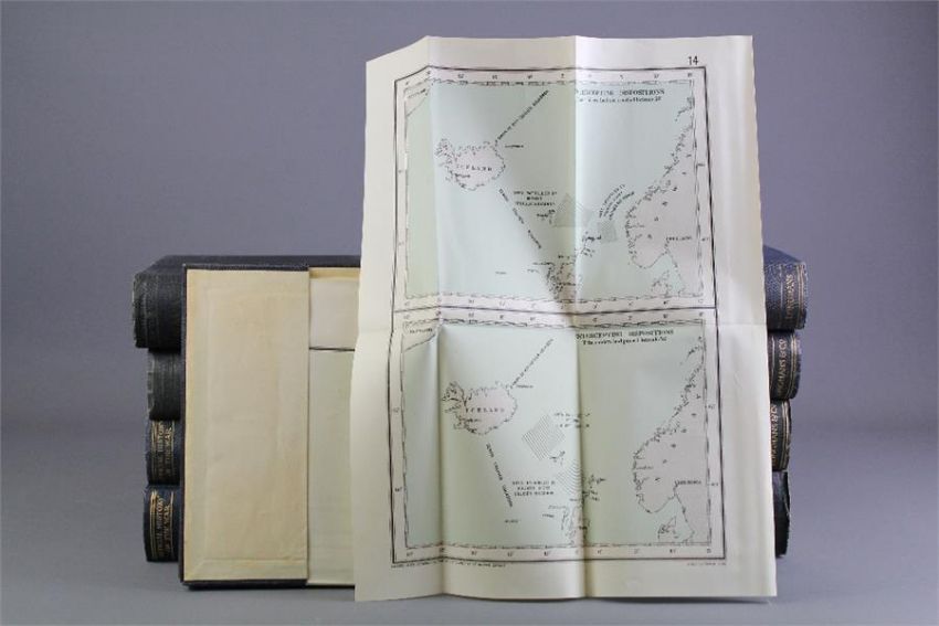 1st Edition Corbett J S & Newbolt H, 'Official History of The War (WWI)'. The book regarding naval operations based on official documents in nine volumes blue gilt cloth. Corbett Vol I 'To the Battle of Falklands' text with five maps and 18 maps under separate cover. Corbett Vol II with seventeen maps, Vol III text and with forty six maps under separate cover, Newbolt Vol IV text and with fourteen maps under separate cover, Newbolt Vol V text and approx 31 maps under separate cover.