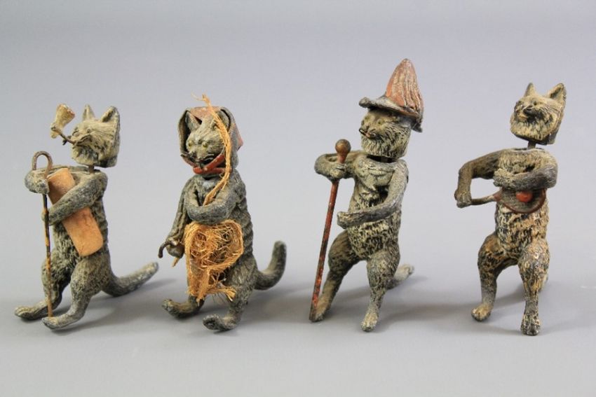 A Set of Antique Cold Cast Bronze Nodding Cats. This lot includes; 'Tennis Player', 'Marching Band Leader', 'Crab-catcher', 'Smoking Cat', approx 7 cms height.