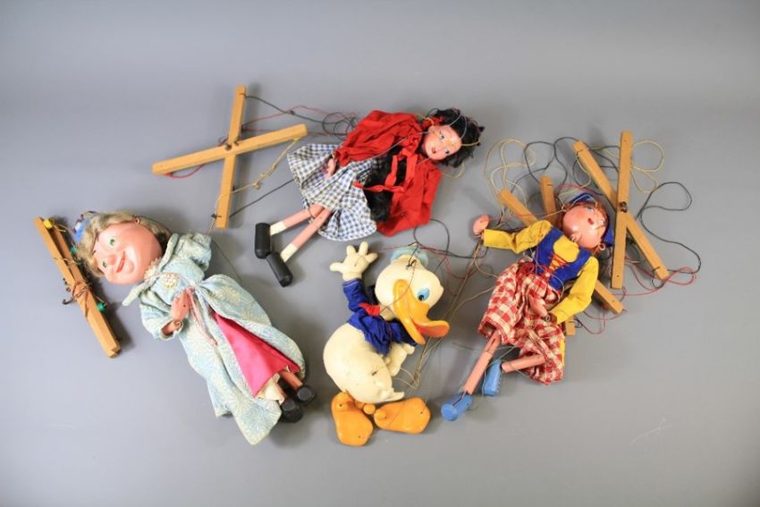 A Collection of Eight Vintage Pelham Puppets. The collection includes a 1950's 'Donald Duck', two 'Fritzi' and five others. Only one of the 'Fritzi' has a box together with a child's vintage xylophone.