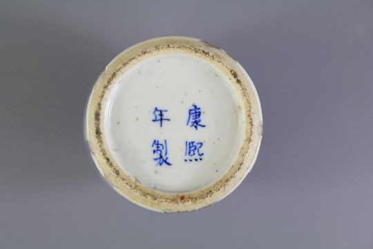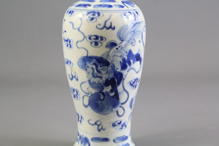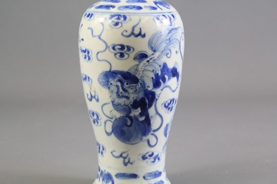 A 19th Century Blue and White Chinese Baluster Vase. The vase painted with chasing dragon amongst cloud scroll with bats, approx 20 cms, bearing Kangxi marks to base.Originally purchased from the 5 day Christies Sale of Ronald Summerfield's Effects at Cheltenham Racecourse. Mr Summerfield was a well-regarded collector of antiques who amassed an extensive collection is his life-time.