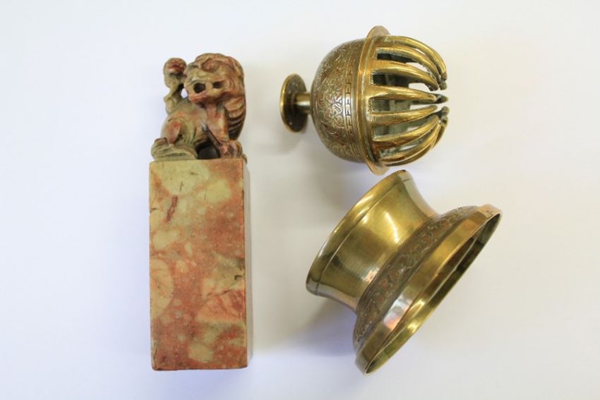 A Chinese 19th Century Soapstone Seal. The square base surmounted by a seated Foo Dog, approx 18 cms together with an Tibetan temple claw bell. (2)