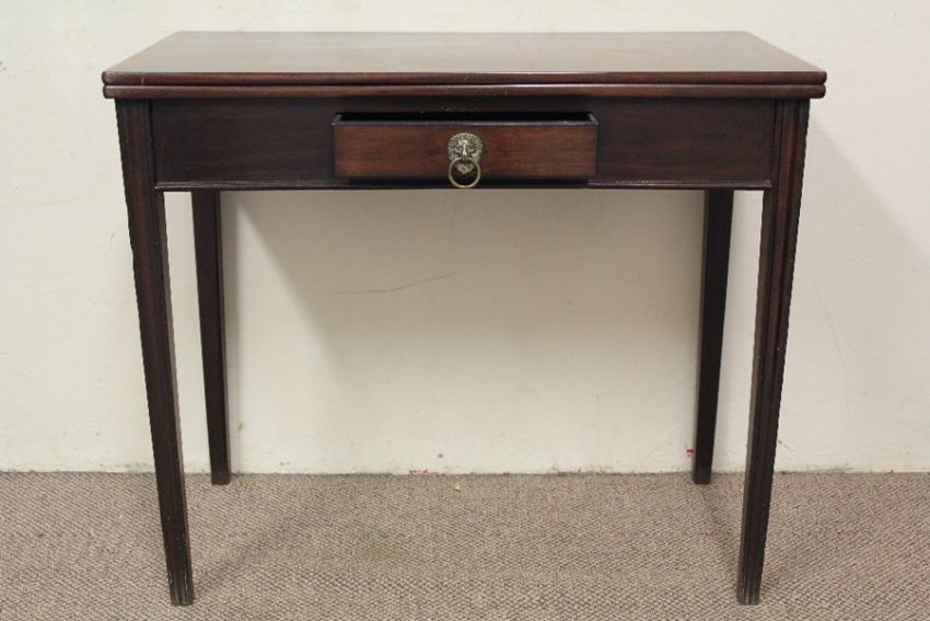 An Antique Mahogany Fold-over Tea Table. The table benefits from a single drawer, on square legs, approx 85 x 43 x 73 cms.
