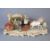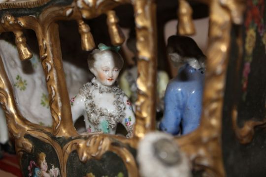 Attributed to possibly Meissen, a Porcelain Plateau Royal Horse Drawn Carriage. This 19th Century piece may represent the arrival of a Royal Couple. The carriage with a gold crown to the center of the roof and edged with 8 gold finials (one broken), is painted with foliate decoration centered with flowers. A pair of footman ride on the rear of the carriage wearing yellow and braided uniform with stockings, buckled shoes and tricorn hats. There is a standing footman dressed in a blue frock coat with purple cape and buckled shoes (one damaged). A stable-hand is depicted steadying the horses. The horses ceremonially harnessed with plume and crown to their forelocks. The whole set on a porcelain plateau representing cobble stones. The base measures approx 58 cms in length and 24 cms in width at it's widest point and the height is approx 27 cms. Crossed sword to base.