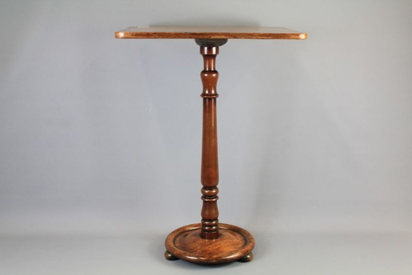 A Victorian Pedestal Wine Table. The rectangular flame mahogany table with central turned leg supported on a round plinth base with three bun feet, approx 54 x 43 x 75 cms h.