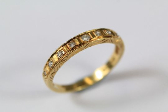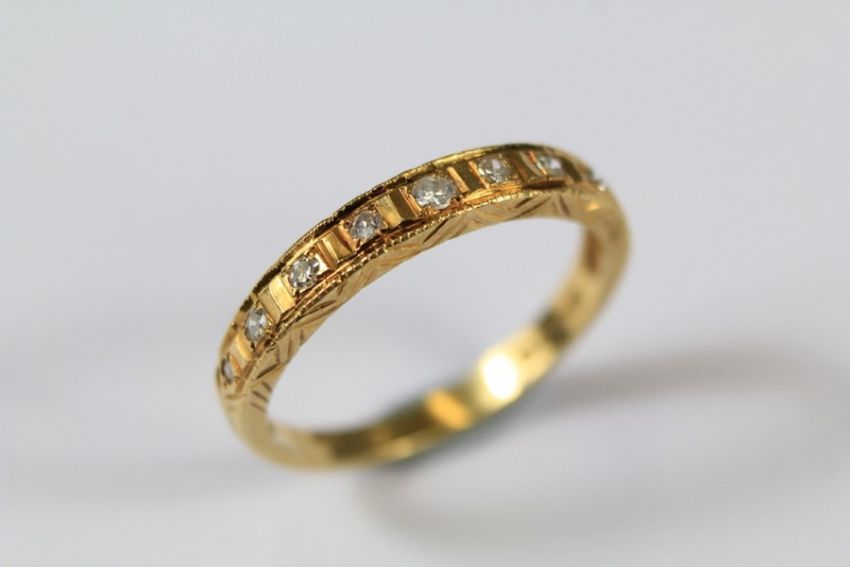 A Vintage 18ct Yellow Gold Half Eternity Diamond Ring. The ring set with approx nine old-cut diamonds, size P, approx 2.5gms.