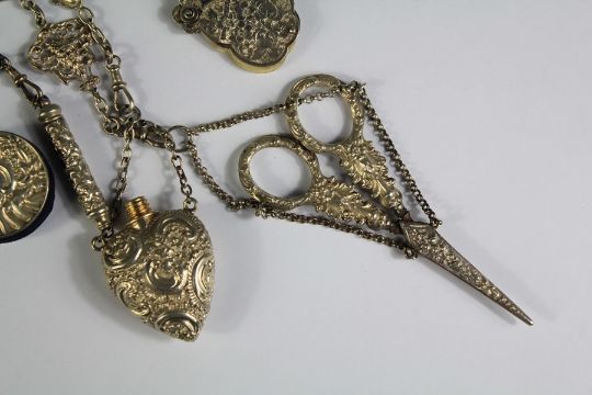 Victorian Silver Hallmarked Chatelaine. The chatelaine bearing Birmingham hallmarks dated 1880 mm SP & B, supporting five chains with a silver and bone notepad Birmingham hallmark dated 1887 mm P.P.C, a silver heart-shaped scent bottle (stopper missing) Birmingham hallmark dated 1894 mm George Unite, together with a silver propelling pencil and a pair of scissors.