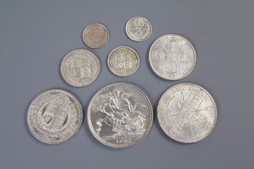 An Uncirculated 1887 Queen Victoria Silver Coin Set. The set comprising crown, double-florin, half-crown, florin, shilling, six pence and 2 x three pence pieces (vgc).