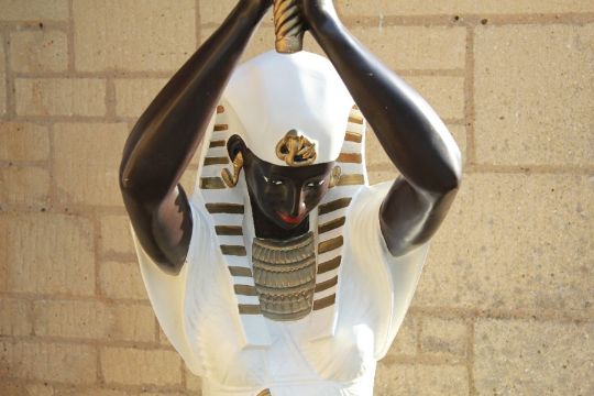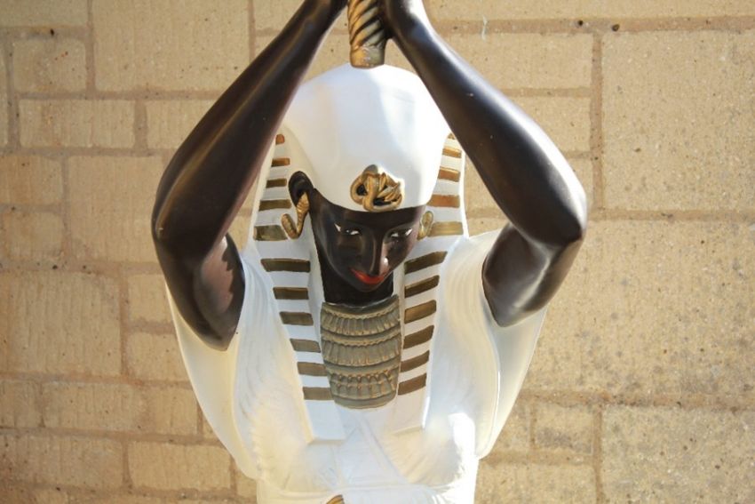 A Vintage Torch Lamp. The lamp modelled as an Egyptian Goddess, possibly Isis, with arms raised to support the globe, approx 190 cms h.
