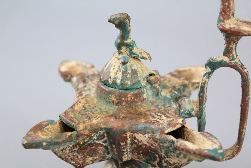 Antiquity - Persian Oil Lamp. The bronze lamp of multi-spout design supported on a spreading foot, hinged cover with bird finial and a looped handle with bird finial. The oil lamp benefits from incised decoration, approx 15 cms.