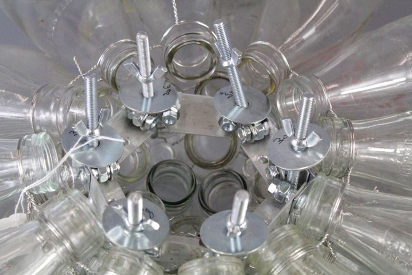 A Glass Novelty Chandelier. The chandelier composed of vintage glass milk bottles designed by Illum8ing.