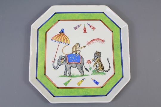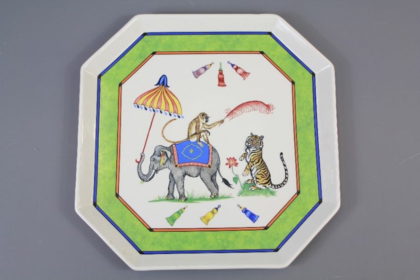 Four Lynn Chase 'Tiger Raj' Hand-Painted Octagonal Trays. The trays painted with elephant, monkey and tiger, beautifully painted to the reverse, approx 33 x 33 cms.Lynn Chase American Artist, Conservationist, who established the Lynn Chase Wildlife Foundation.