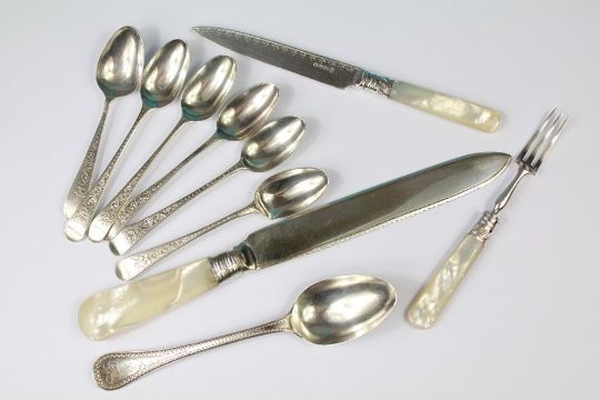 Quantity of Silver. This lot includes Mother of Pearl handled knife/fork set and spoons (six Georgian)