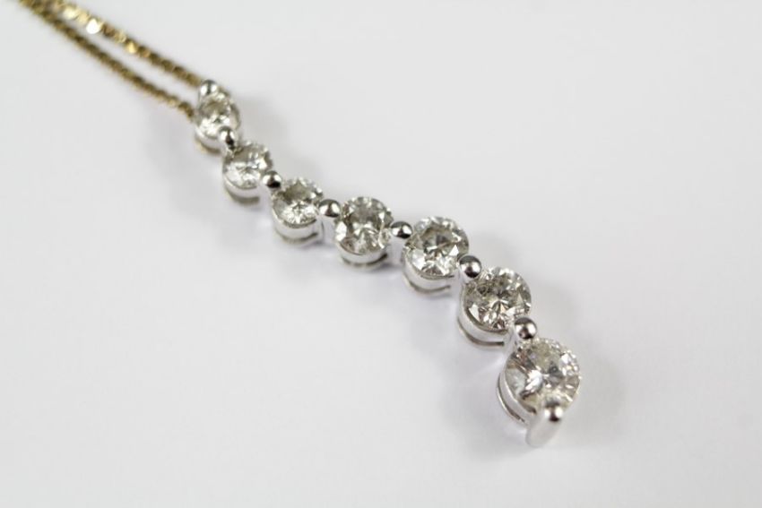 A 14 ct White Gold Wave Pendant. The pendant suspended from a fine 14 ct white gold chain. The pendant set with seven brilliant-cut diamonds, approx 2.50 - 4.00 mm, total weight approx 1 ct, combined weight approx 3.2 gms.