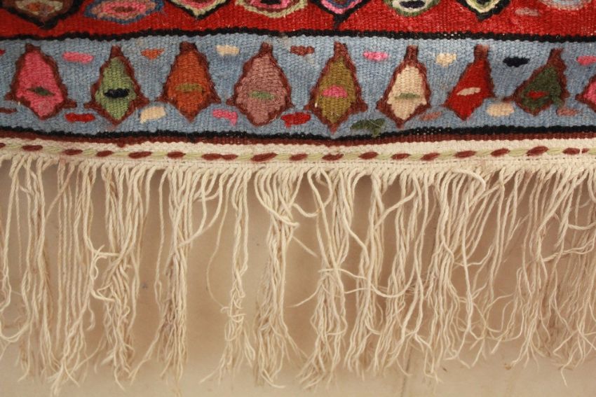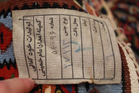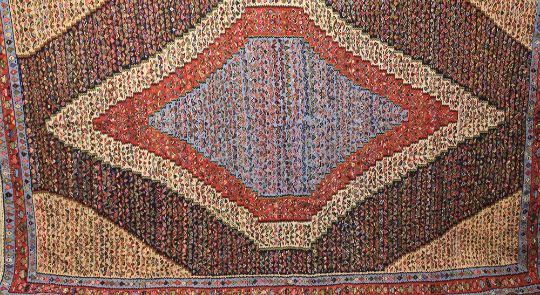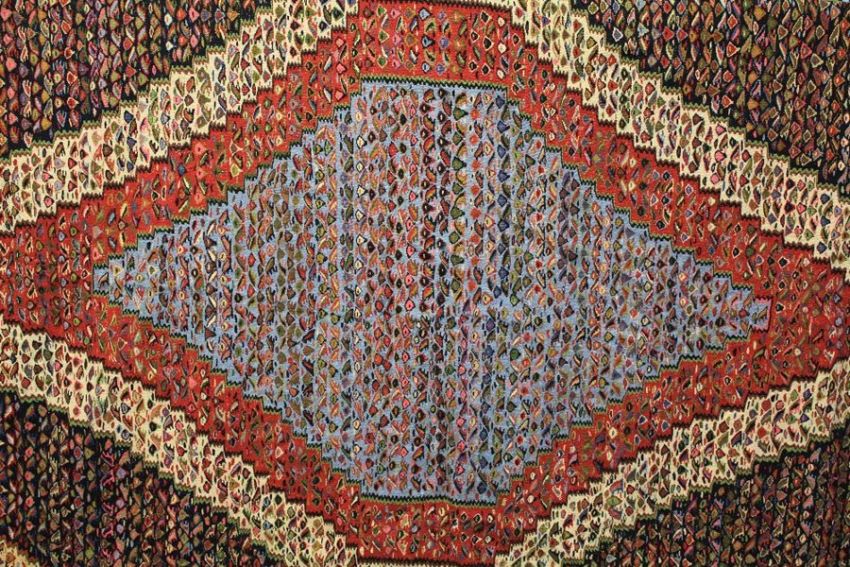 An Antique Persian Qashquai Wool Carpet. The carpet of striking colours and geometric patterns, turquoise blue central medallion with cream, pink, cobalt and claret colouring, approx 290 x 200 cms, selvedges and tassels complete.Note: Property of lady formerly from Isfahan Iran.
