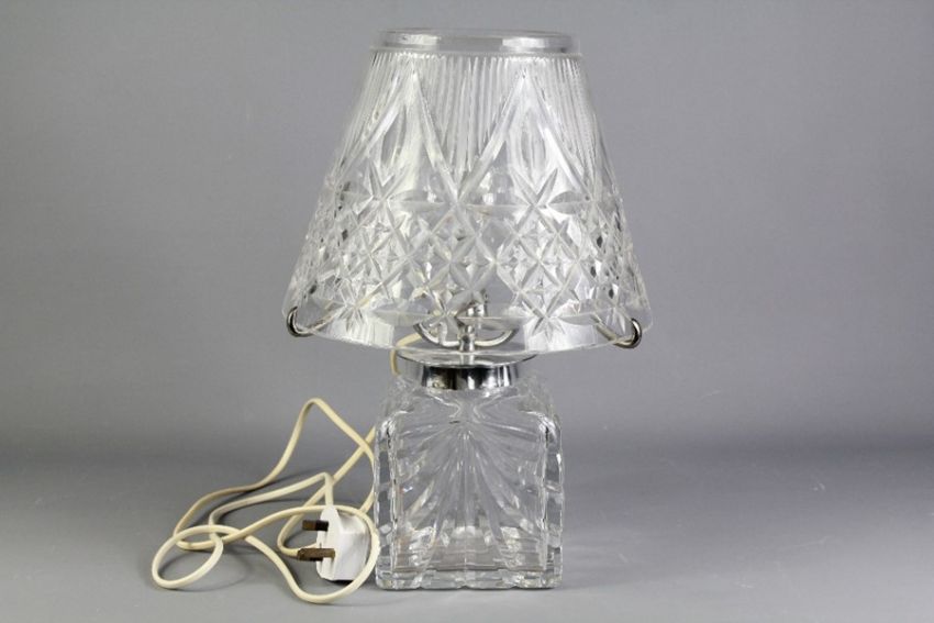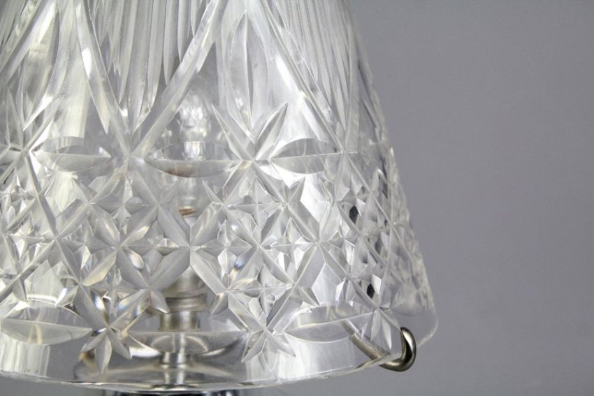 A Webb Corbett Cut-glass Lamp and Shade. The stand has three sockets, the shade measures top dia approx 14 cms, base approx 26 cms and h approx 20.5 cms.