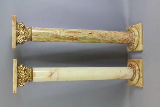 A Pair of Marble and Gilt Brass Plant Stands. The stands depicting pillars, approx 90 cms high. (loss evident to one corner)
