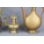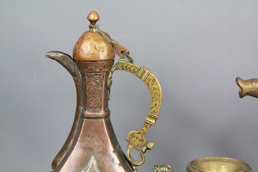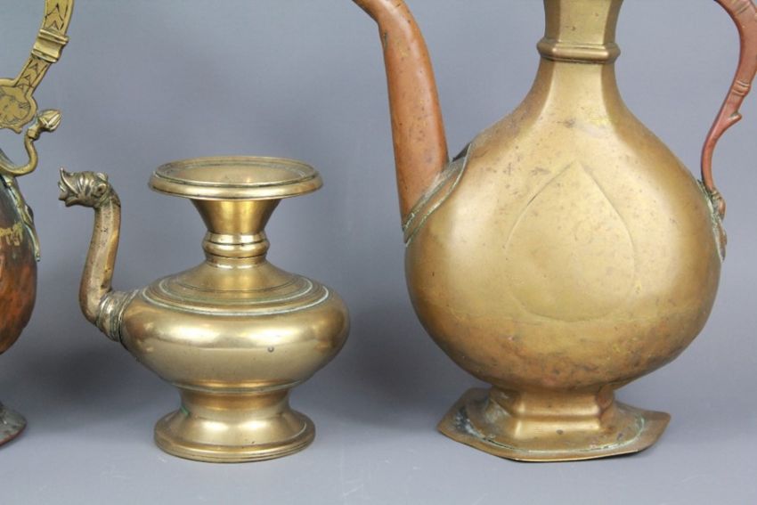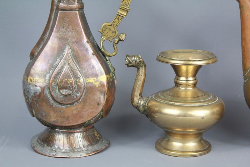 This lot includes a small Mughal brass and copper ewer. The brass ewer with a mythical mask to the spout, approx 22 cms with another later Uzbekistan copper ewer with foliate decoration approx 26 cms and a Mughal Lota with a mythical animal to the spout, approx 11 cms. (3)