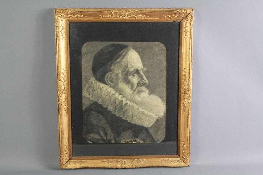 Antique Pencil Study of a Bishop. The well-executed drawing depicting a side profile of a bishop in Elizabethan costume, the drawing obscurely signed Francis W. Slaughter, approx 38 x 31 cms framed and glazed together with a engraving entitled 'Speke Hall The Gateway' by W.R Wakefield signed in pencil to the lower left margin, framed and glazed. (2)