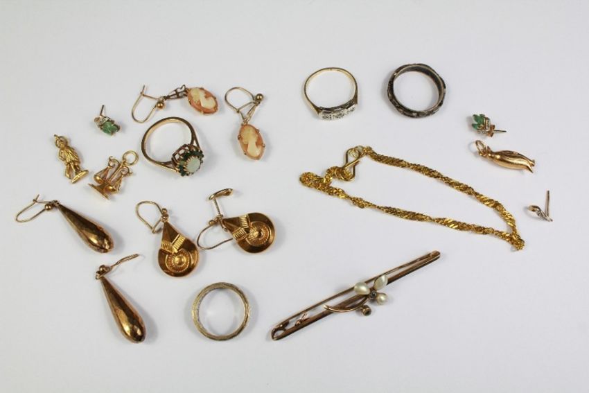 Miscellaneous 9ct Gold Jewellery. This lot includes three pairs of earrings, three 9ct gold charms (penguin, justice scales and water-carrier), white stone earrings, white and green stone earrings, 9ct diamond ring size P, opal ring size O two eternity rings and a 9ct gold seed pearl bar brooch, approx 27 gms.
