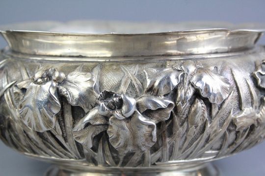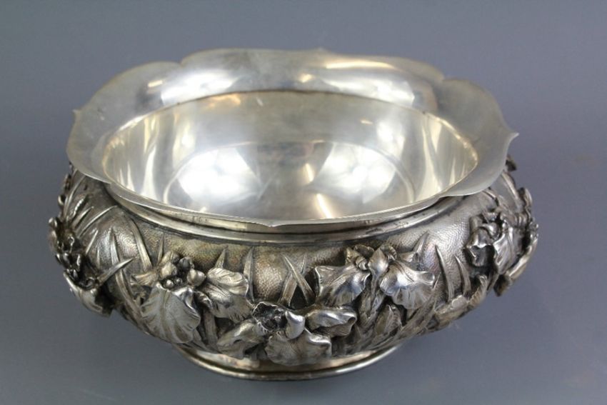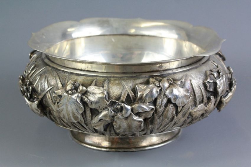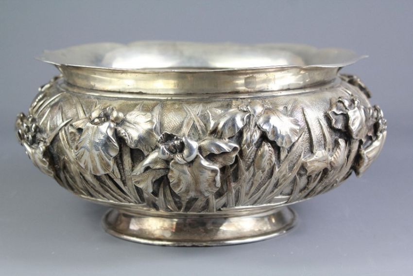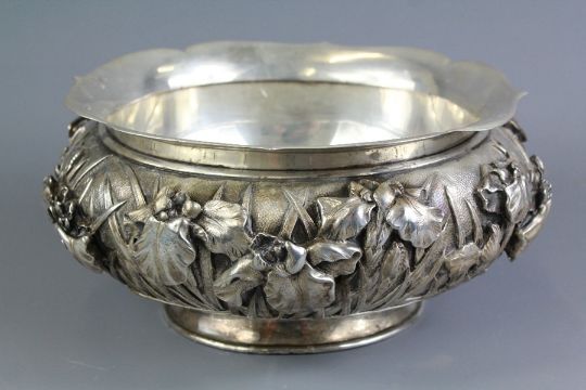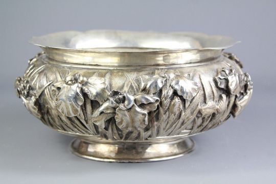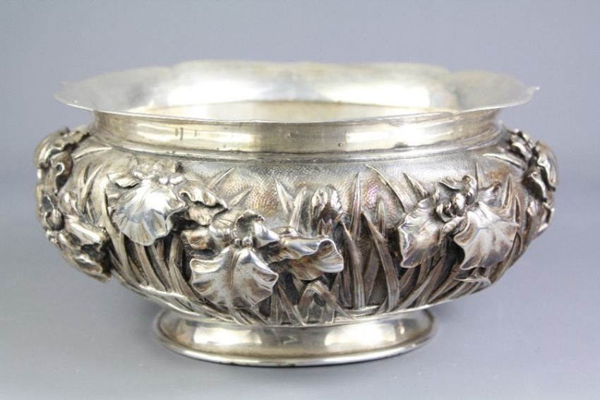 An Antique Japanese Silver Rose Bowl. The bowl beautifully embossed with Iris blooms on stippled ground, approx 960 gms, approx 20.5 d cms x 11 cms h x 65 circumference, Japanese character marks to base.