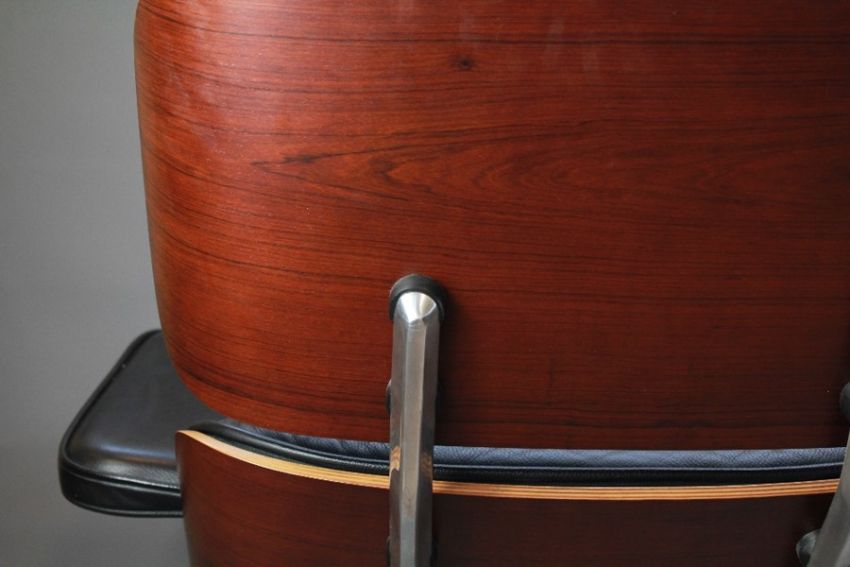 Vintage Rosewood and Black Eames Lounge Chair.  The chair with leather back, seat and arm rests upon a rosewood veneered frame and cast steel and aluminium base, 86 h x 85 cms, based on the original design by Charles Eames together with a matching footstool, manufacturers metallic label ICF Spa Milan to both the chair and footstool. (the chair with two buttons missing)Note: Based in Milan, ICF were one of the four original manufacturers who were granted a license by Herman Miller Inc. to reproduce Charles and Ray Eames chairs.