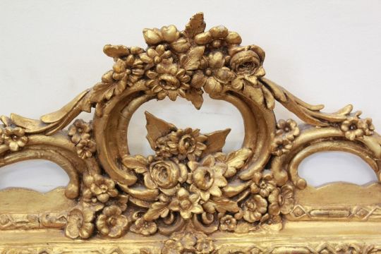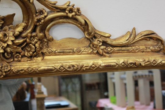 A Large 19th Century Gilt Wood Overmantel Mirror. The mirror with foliate acanthus and laurel leaf frame, elaborate foliate crown, approx 150 x 115 cms