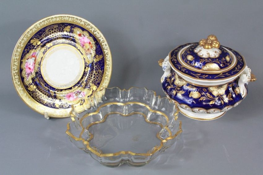 A Samuel Alcock Porcelain Sucrier and Cover. The sucrier dated C1835 with a hand-painted plate by the same hand and a Victorian gilded bowl. (3)