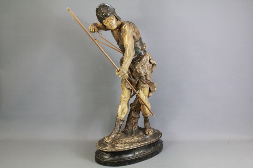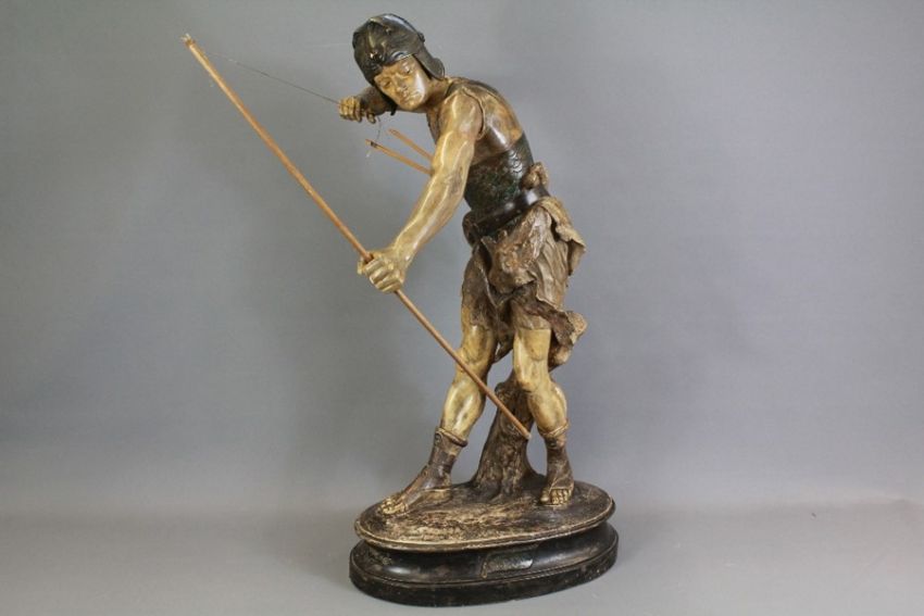 A Circa 1900 French Plaster Figure of a Roman Archer. The archer depicted standing with arms poised with bow and arrow, approx 92 h cms. Inscribed Salon du Cyde du Palais Paris 1904.