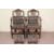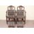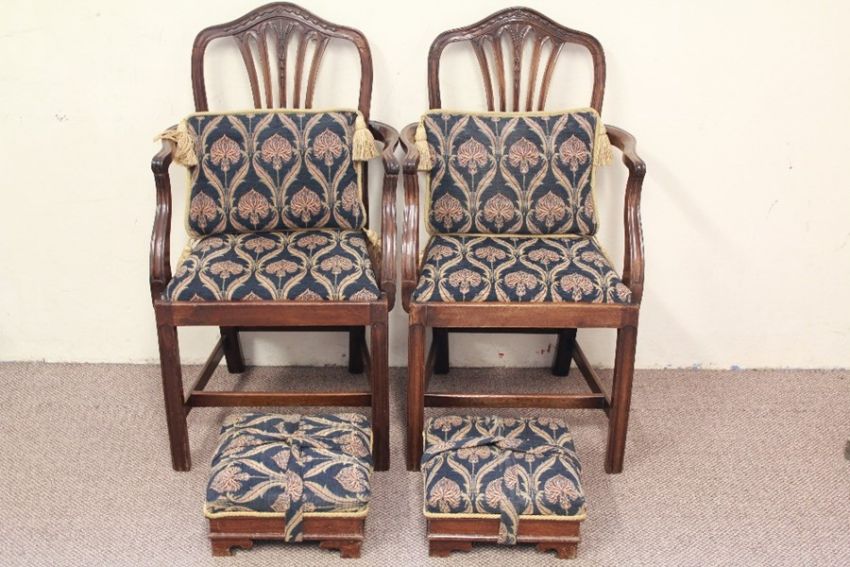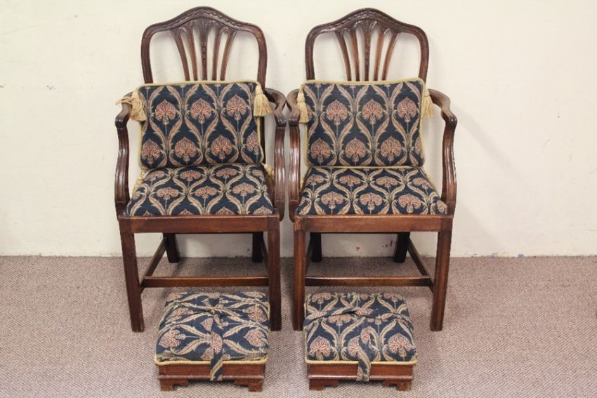 A Pair of Hepplewhite Dining Chairs. The carvers with carved slatted backs with wheat-sheaf motif, the elbow rest with good patina, deep green upholstery with a pillow each and matching footstools.