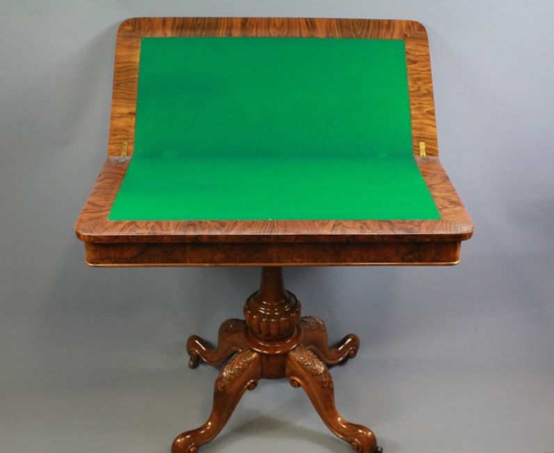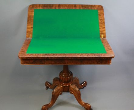A 19th Century Walnut Card Table. The table interior with green baize-lined interior with turned column on four cabriole supports with scroll feet, approx 92l  x 46w x 76 cms h.