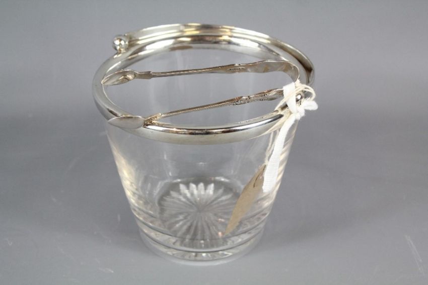 A Cut Glass and Silver Ice Bucket. The ice bucket with silver rim and handle London hallmark, dated 1950 complete with a pair of silver plated tongs.